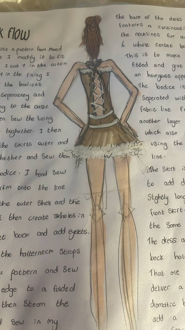 The Dudley dress takes inspiration from the art our founder ,Emily Marlettia shaw ,grew up around . The particular piece that inspired her to design this piece was a first edition Christa Kieffer of nights in Paris . The romanticised depictions of women in ribbons and fur and flowing dresses enveloped her into a romanticised state . Emily wanted to merger the styles of today with the romantic beauty of that painting and so the Dudley dress was made . The dress features a corset bodice with a halter tie back neck featuring a sweetheart neckline lined with white feathers . It has white lining adding contrasts to the piece and a tiered skirt at the back adding volume and structure . The piece is created to fit a size 6 and the first sale of this piece is a sample design and is £60 but a custom version can be produced on inquiry by emailing @marlettiafashion@gmail.com and requesting a tailored version which price is discussed on interest .